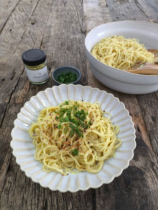 Die Zwiebel klein hacken und in einer Pfanne mit Omas Butteröl andünsten. Sahne, Frischkäse und Käsegourmet hinzufügen und alles miteinander verrühren. Die Pasta nach Packungsbeilage zubereiten und mit der Käsesauce vermengen.